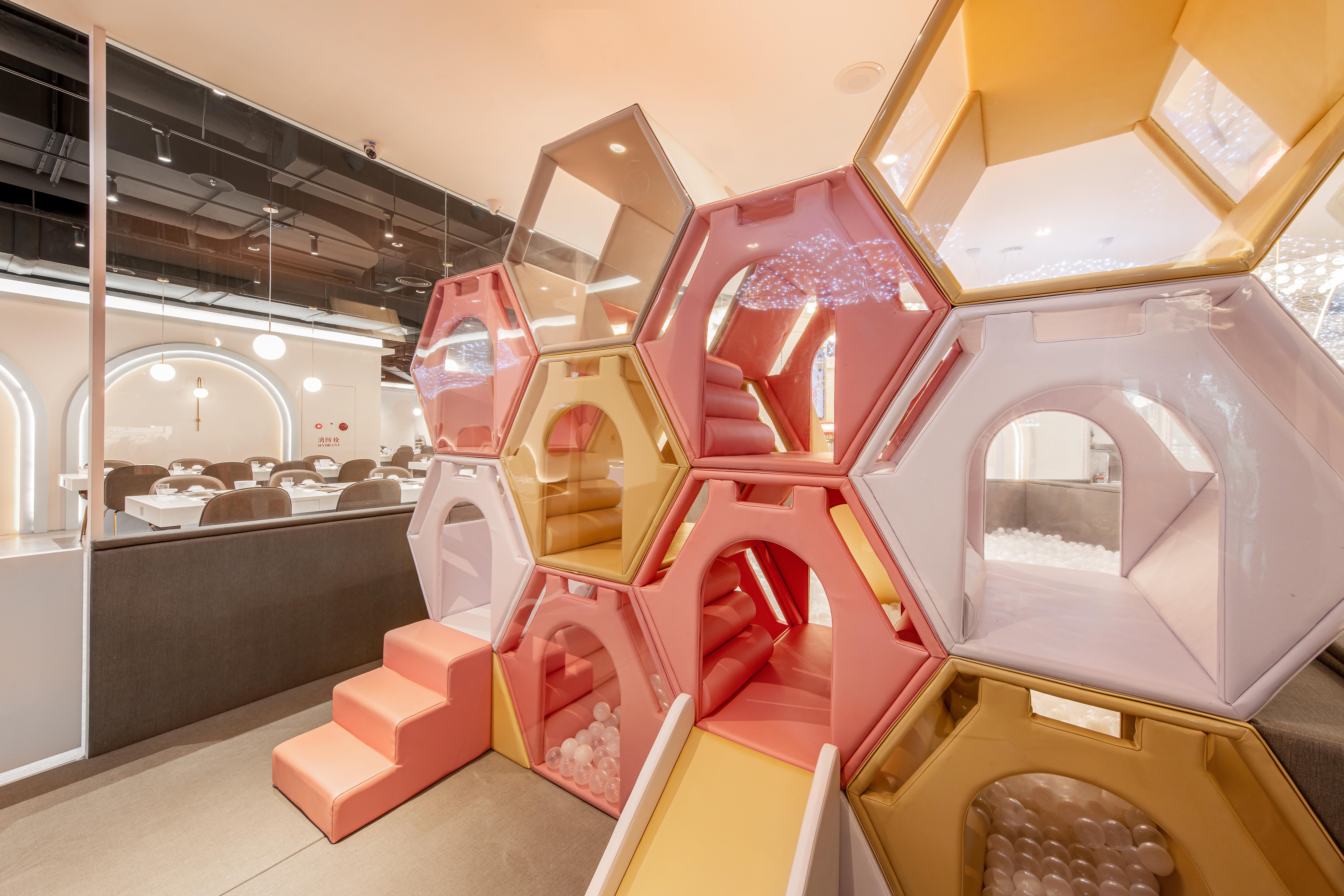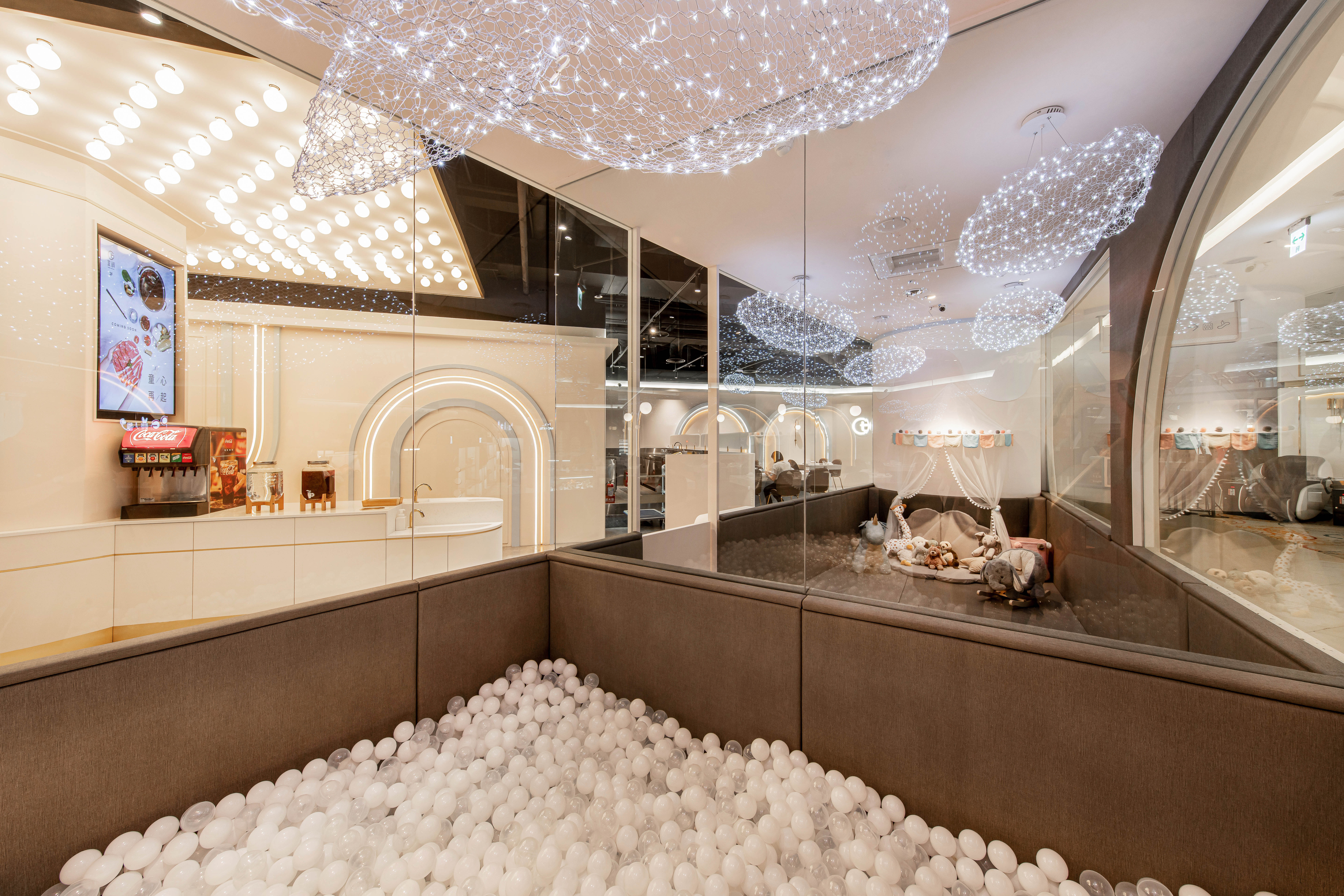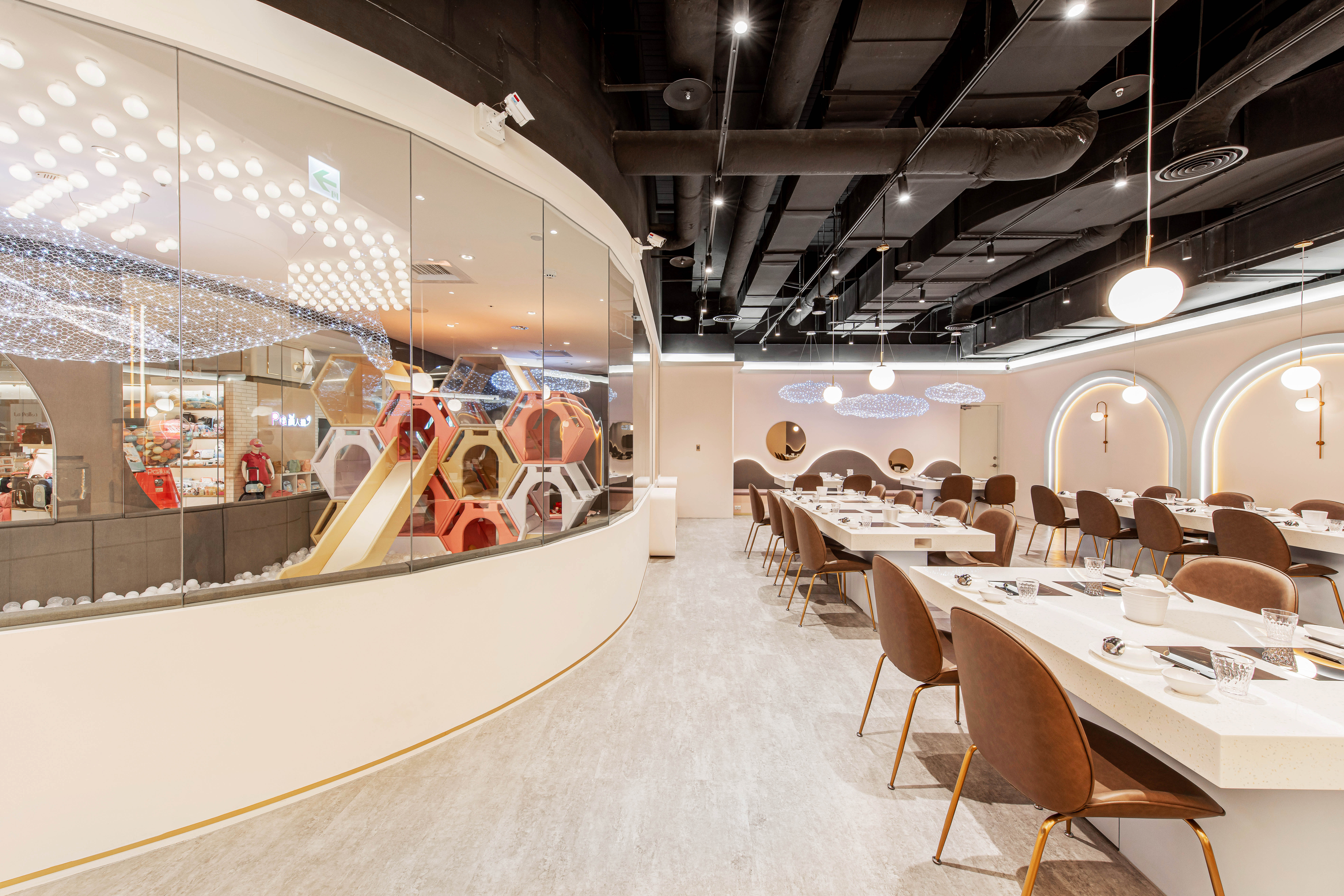 在過去親子餐廳大多是以用餐為主遊戲區為輔,但在本案的設定則是將遊戲區作為重點設計,以此延伸出的餐飲環境,不管是裝潢設計還是餐飲本身,無一處不緊繫著親子相處。通透的玻璃櫥窗,不僅讓空間做出區隔性,又能營造出視覺穿透的效果,同時也能讓家長們安心孩童們入內遊戲。相較於一般遊戲區傾向五彩繽紛的調性,低飽和度的色彩配置,更加彰顯了孩子們來到此處所賦予空間那獨有爛漫的天真「色彩」,上方鯨魚造型燈飾象徵「母愛」意象,期待每位孩子置身其中都能帶著愛與祝福開心遊樂。並且設計團隊也貼心將區域分成兩塊,一為一歲以下幼幼區,以及以一歲以上兒童區,在歡樂遊戲之中,也能加強孩童間的安全性。