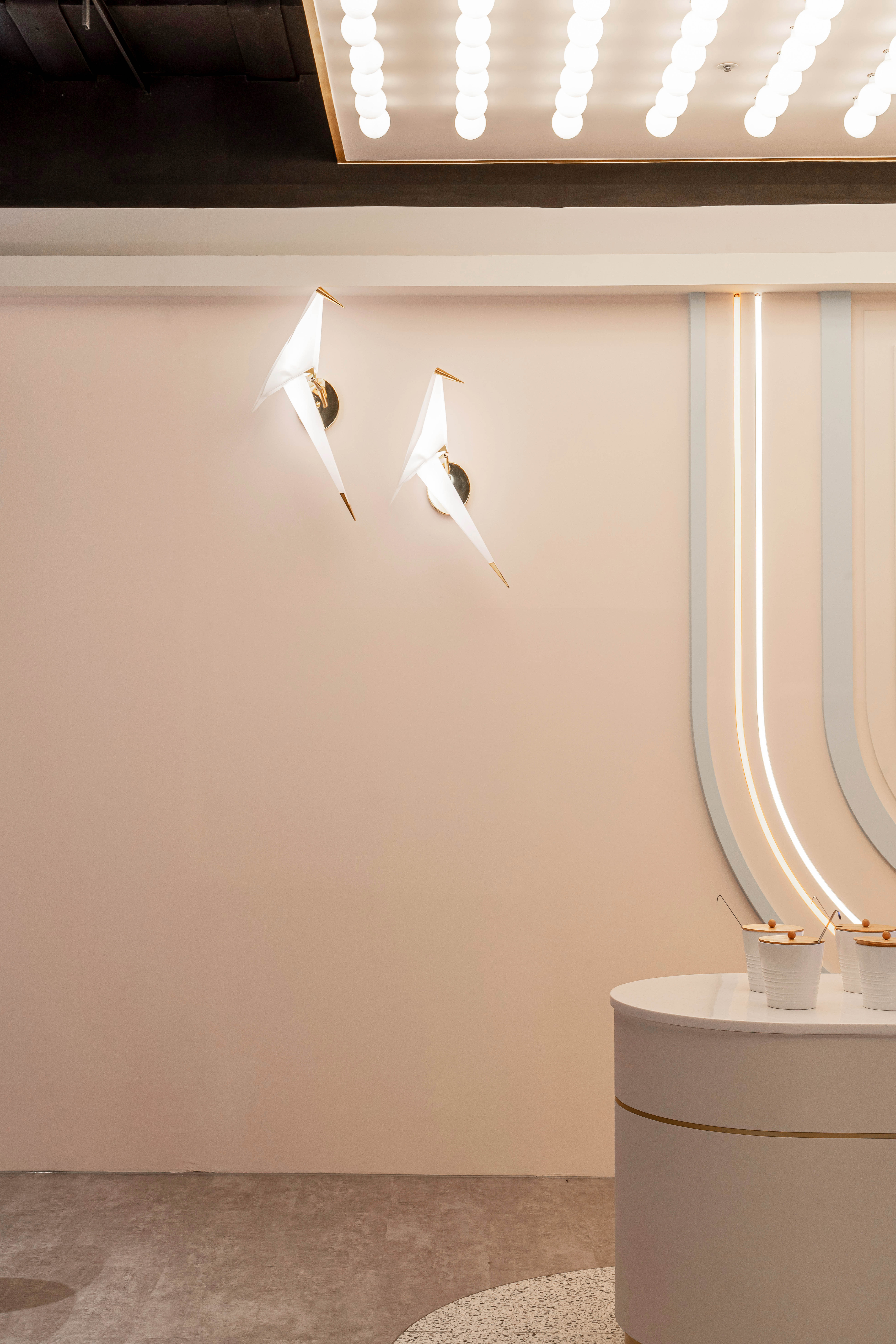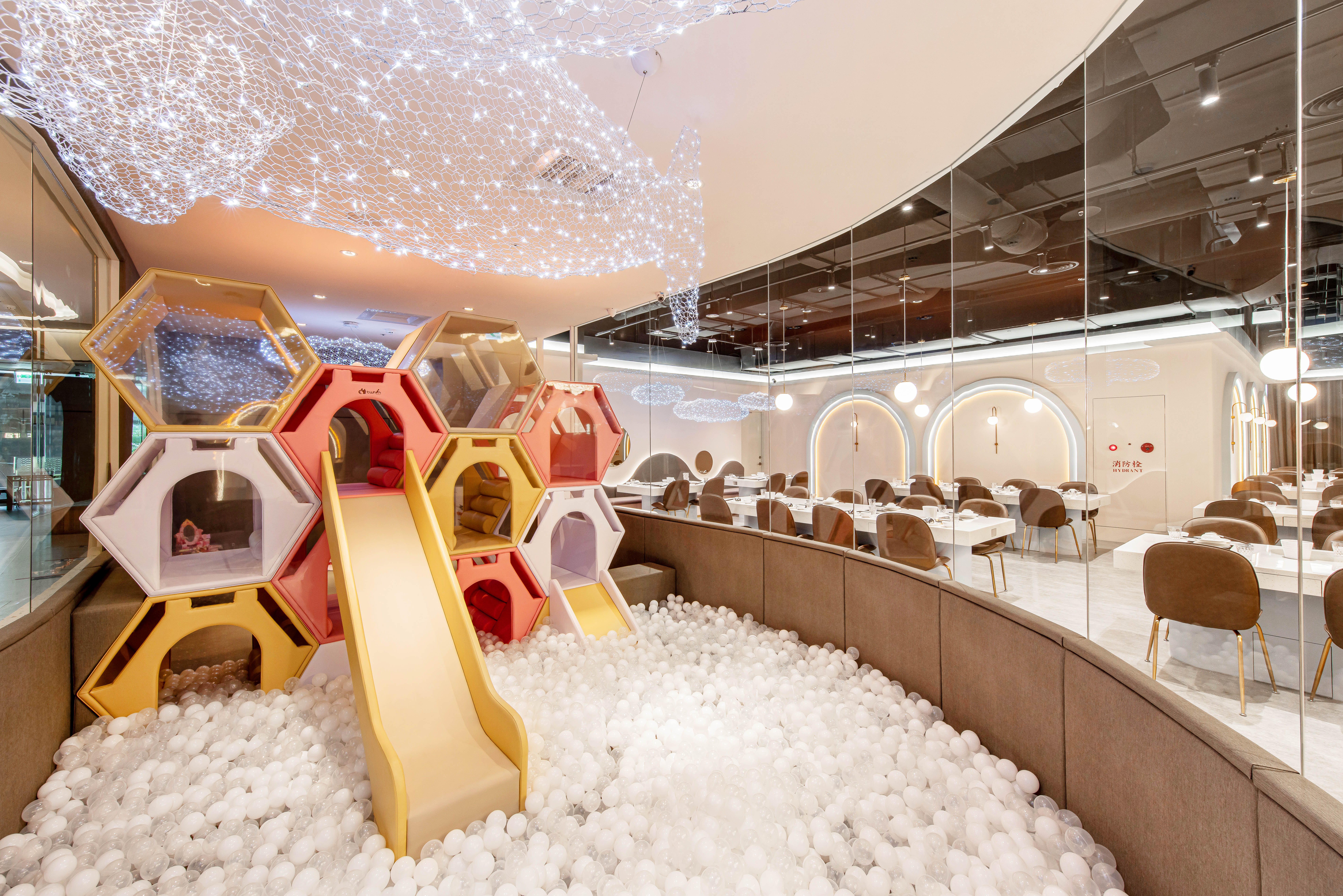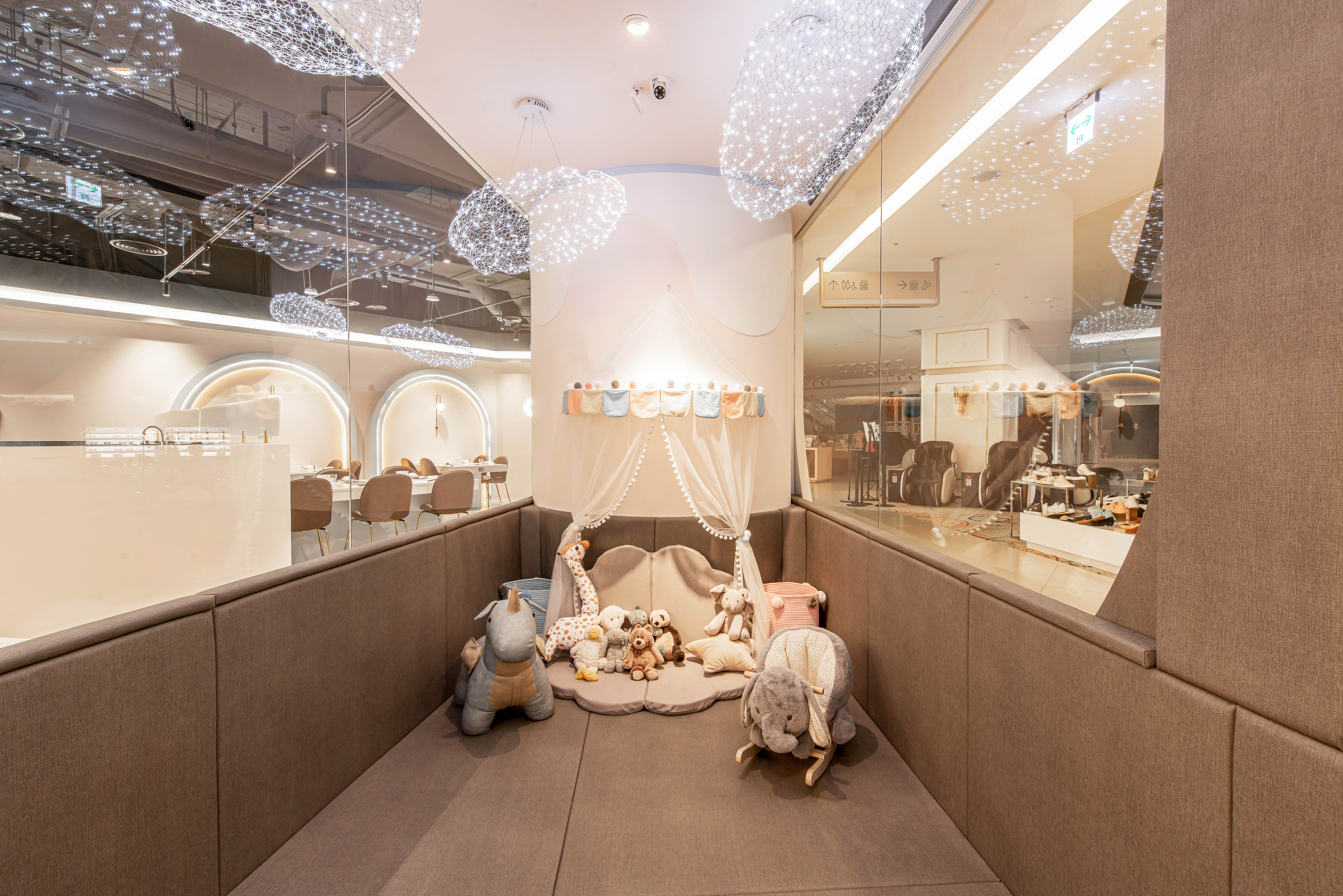 在過去親子餐廳大多是以用餐為主遊戲區為輔,但在本案的設定則是將遊戲區作為重點設計,以此延伸出的餐飲環境,不管是裝潢設計還是餐飲本身,無一處不緊繫著親子相處。通透的玻璃櫥窗,不僅讓空間做出區隔性,又能營造出視覺穿透的效果,同時也能讓家長們安心孩童們入內遊戲。相較於一般遊戲區傾向五彩繽紛的調性,低飽和度的色彩配置,更加彰顯了孩子們來到此處所賦予空間那獨有爛漫的天真「色彩」,上方鯨魚造型燈飾象徵「母愛」意象,期待每位孩子置身其中都能帶著愛與祝福開心遊樂。並且設計團隊也貼心將區域分成兩塊,一為一歲以下幼幼區,以及以一歲以上兒童區,在歡樂遊戲之中,也能加強孩童間的安全性。