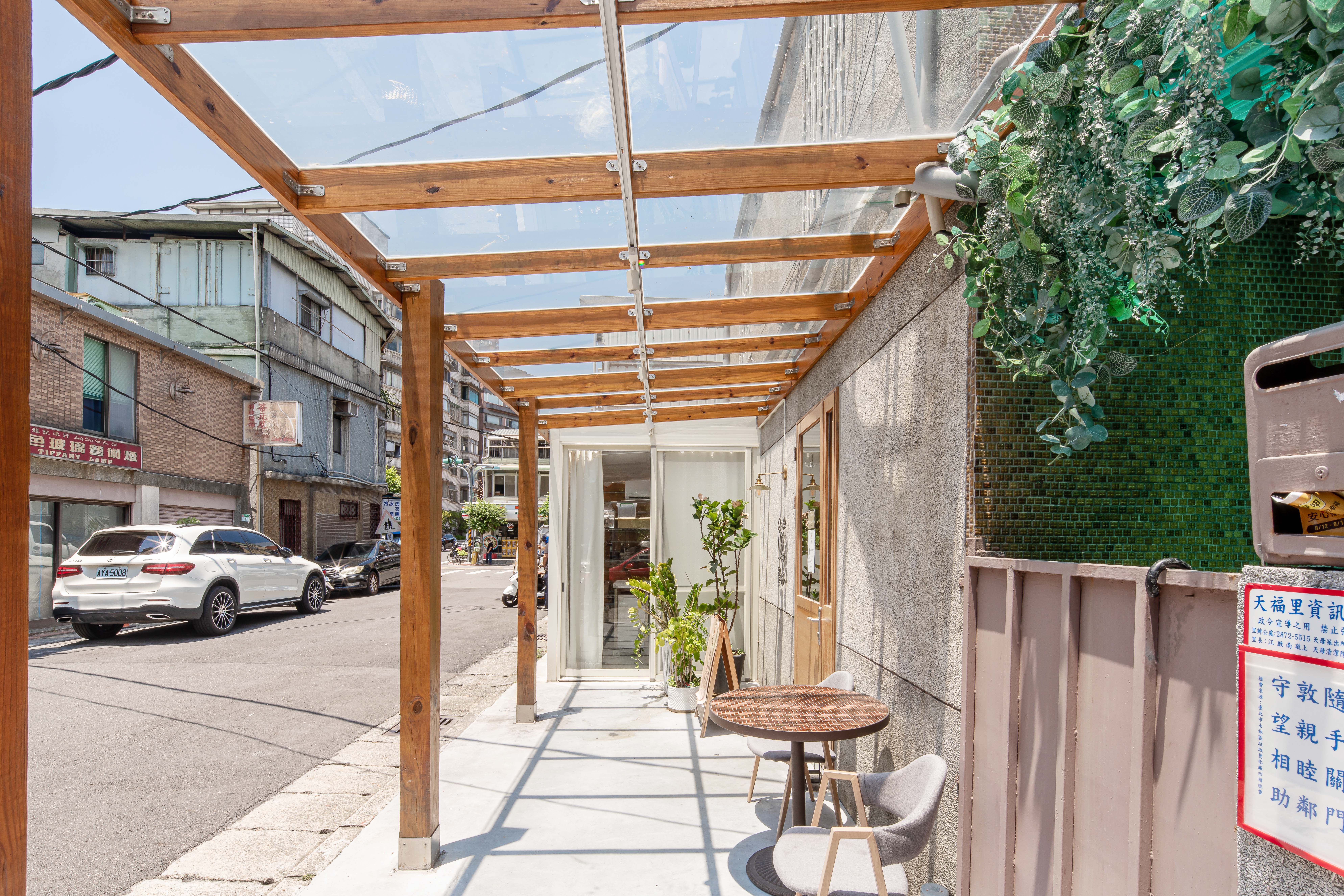 ,小巧卻足以讓人駐足停留許久,腳下踩著拼接的花磚、仿清水模的牆面和原木的玻