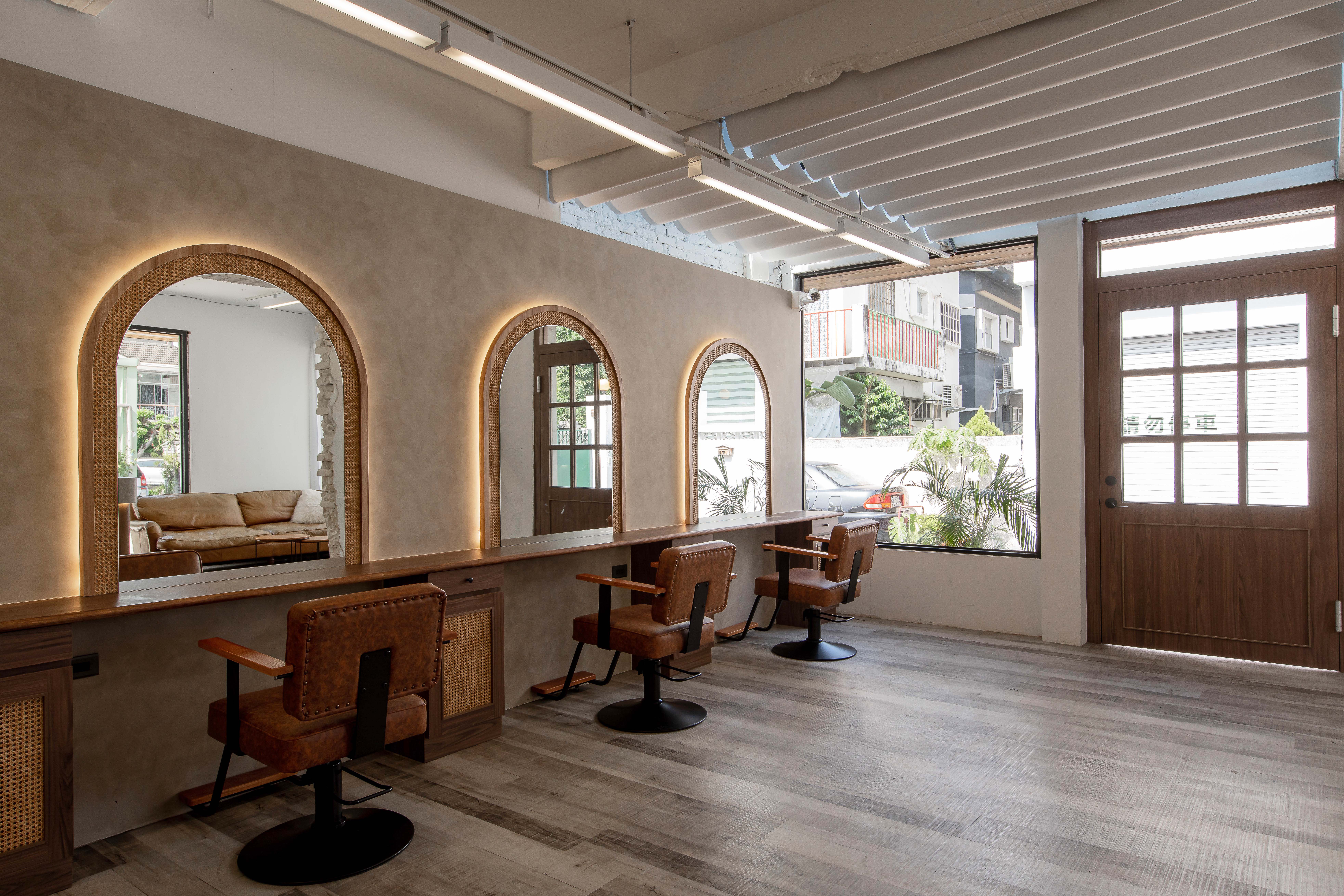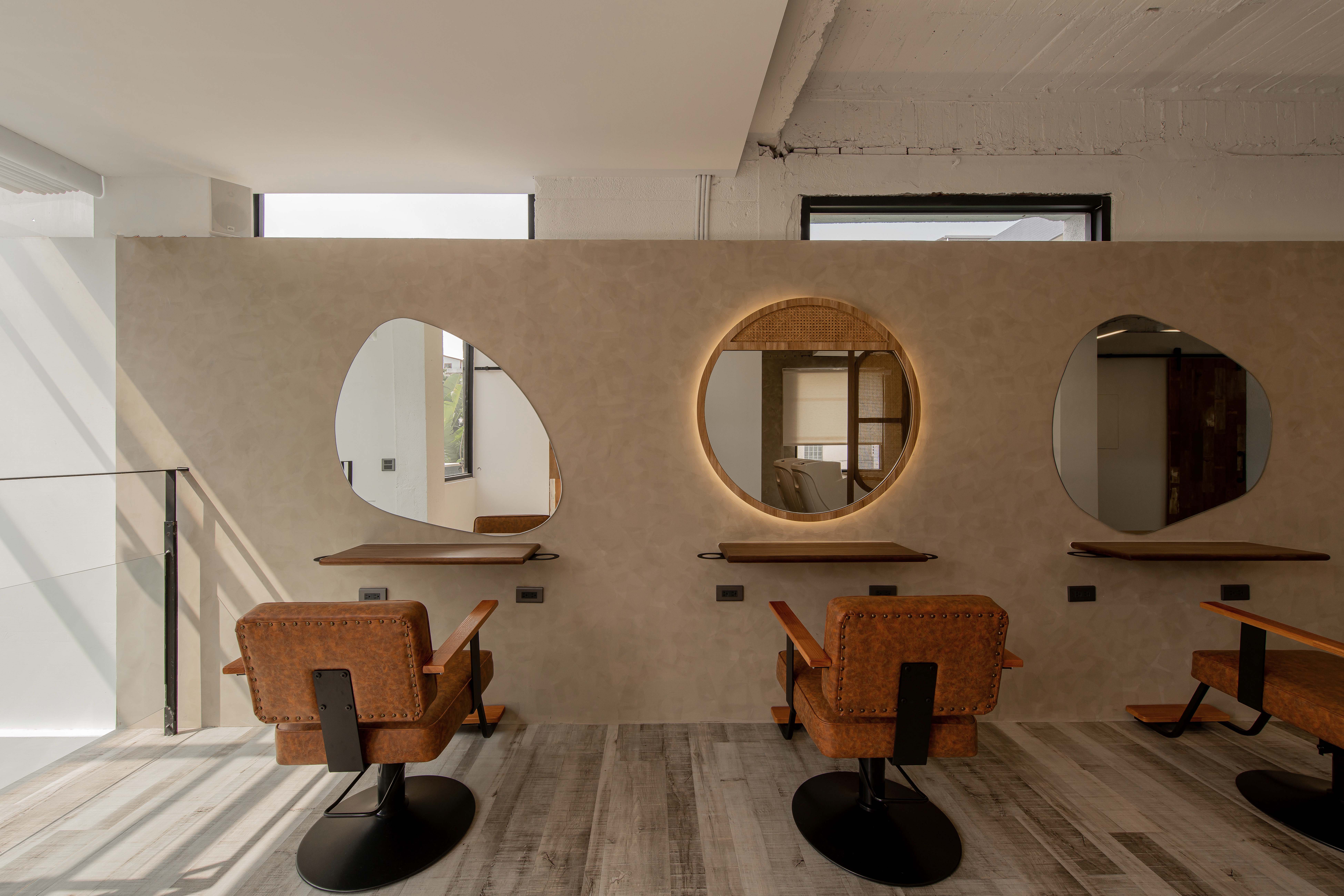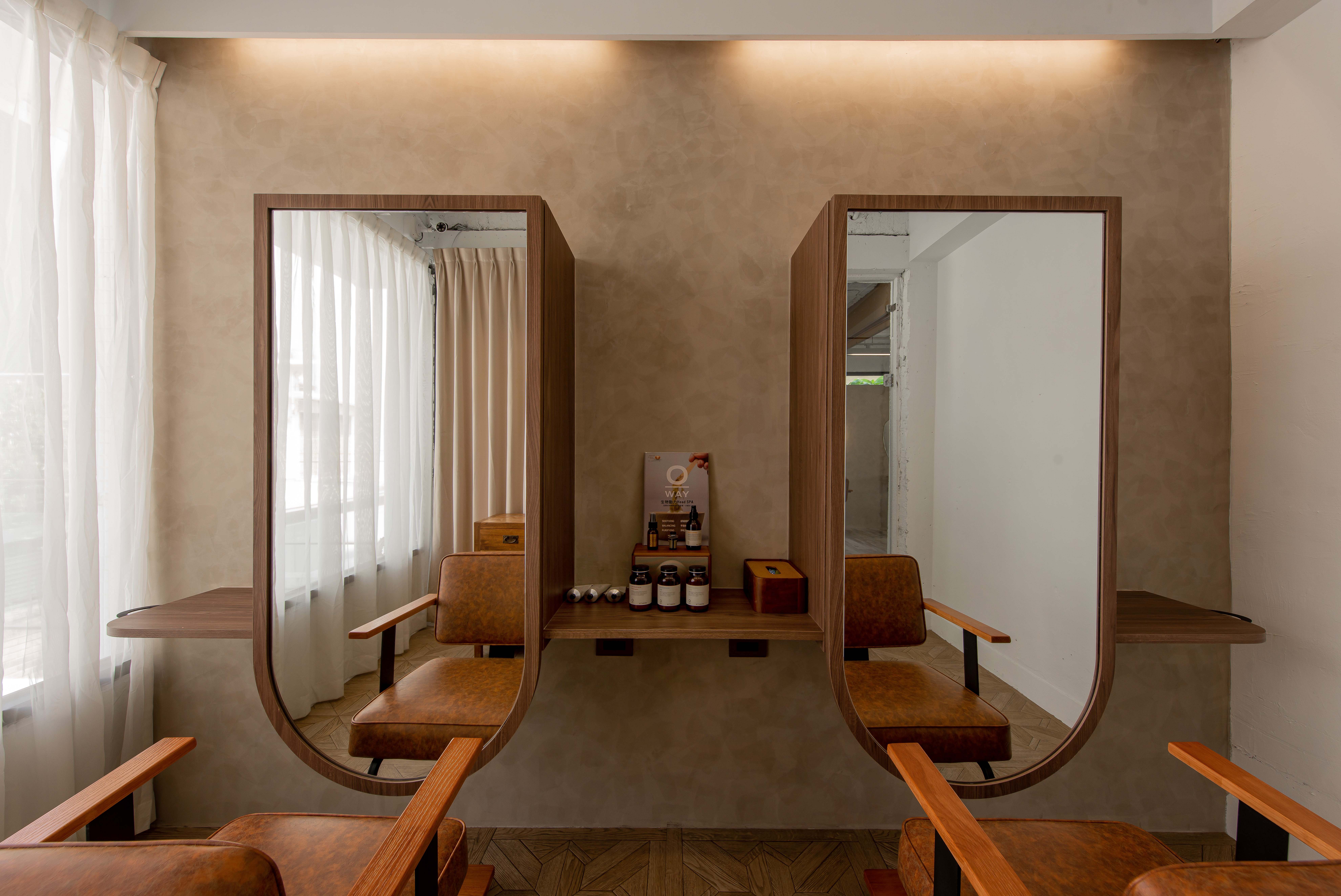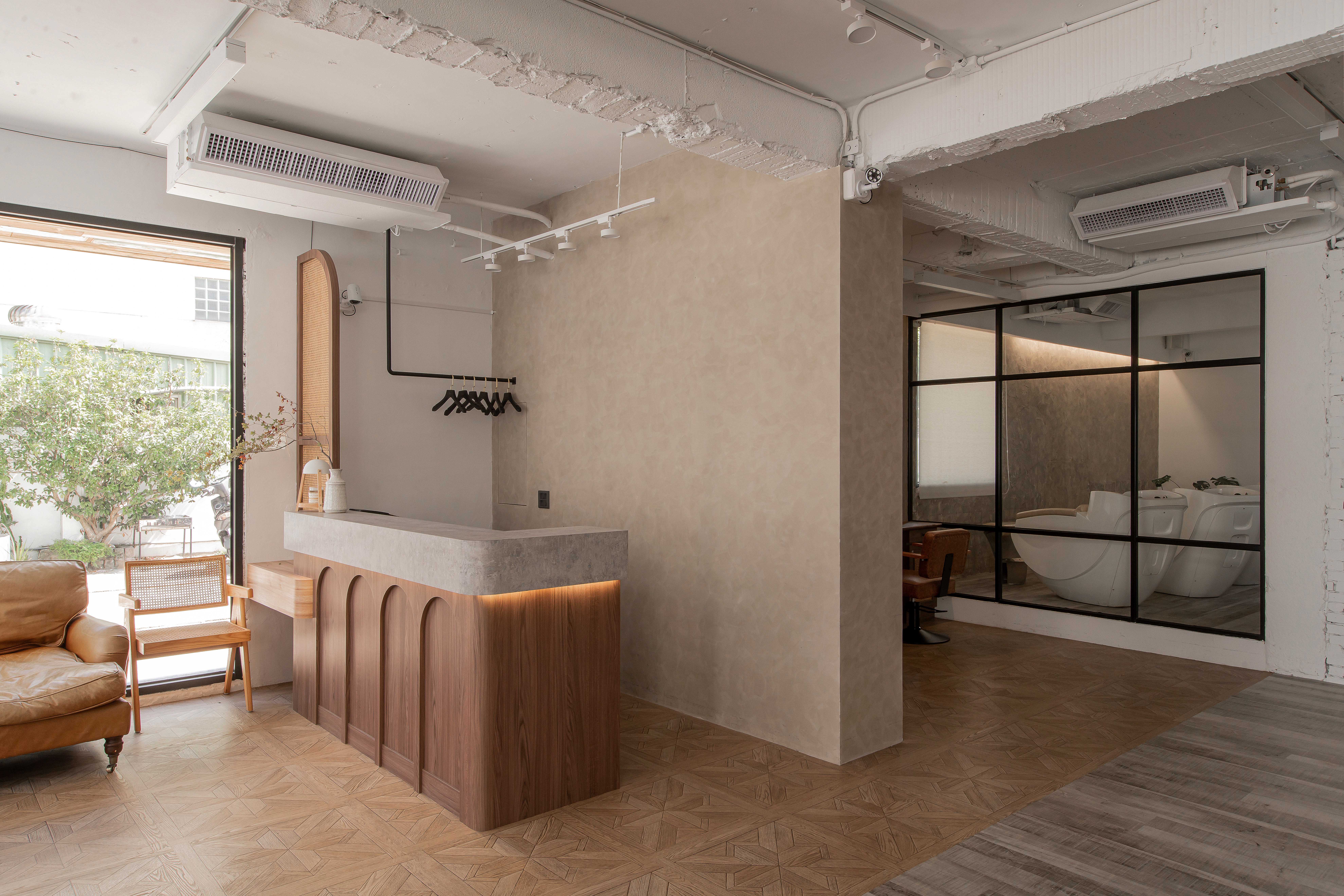 以不修邊幅的隔間及梁柱揉入空間之中,讓美髮區域設計得別具一格,採用了日式風