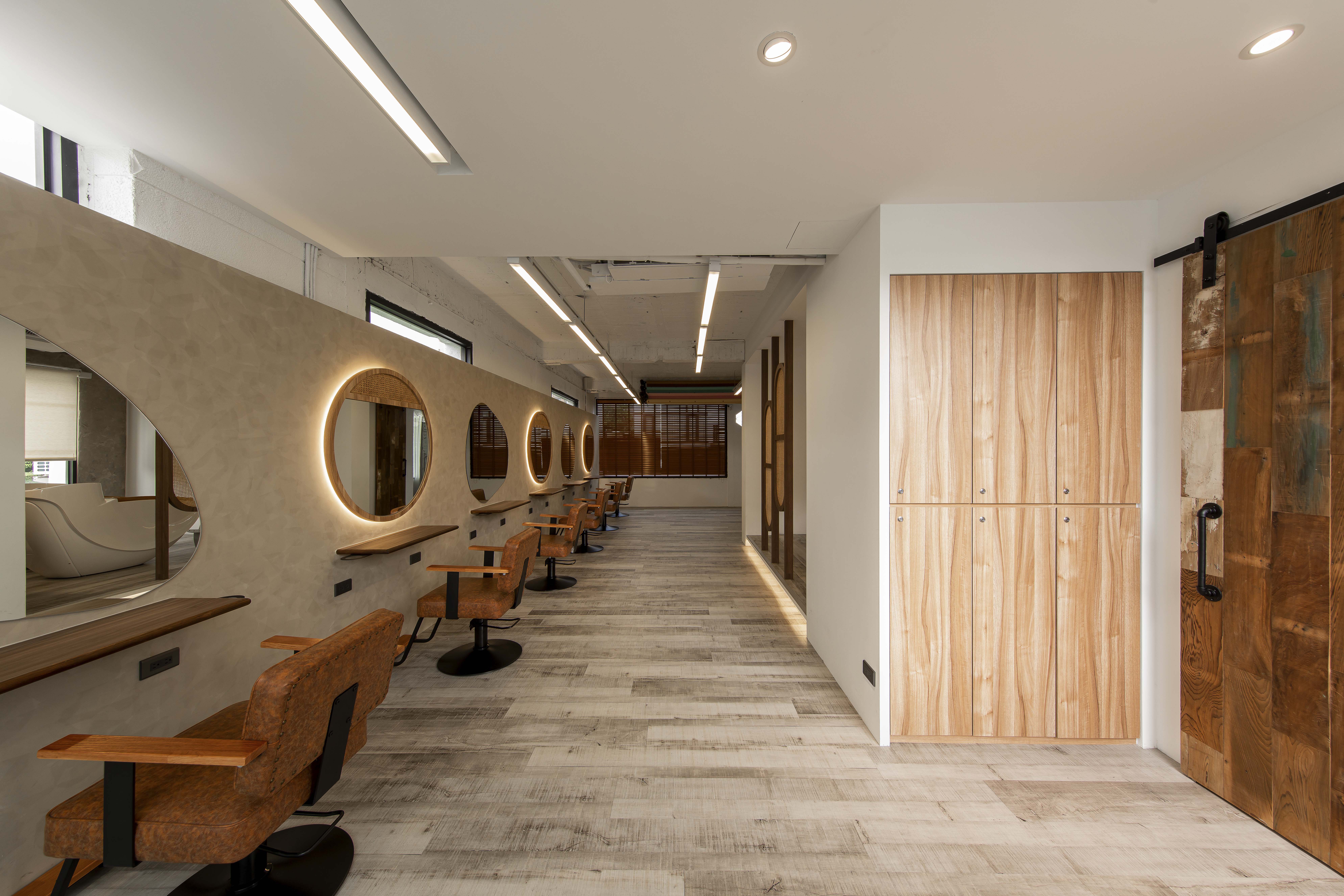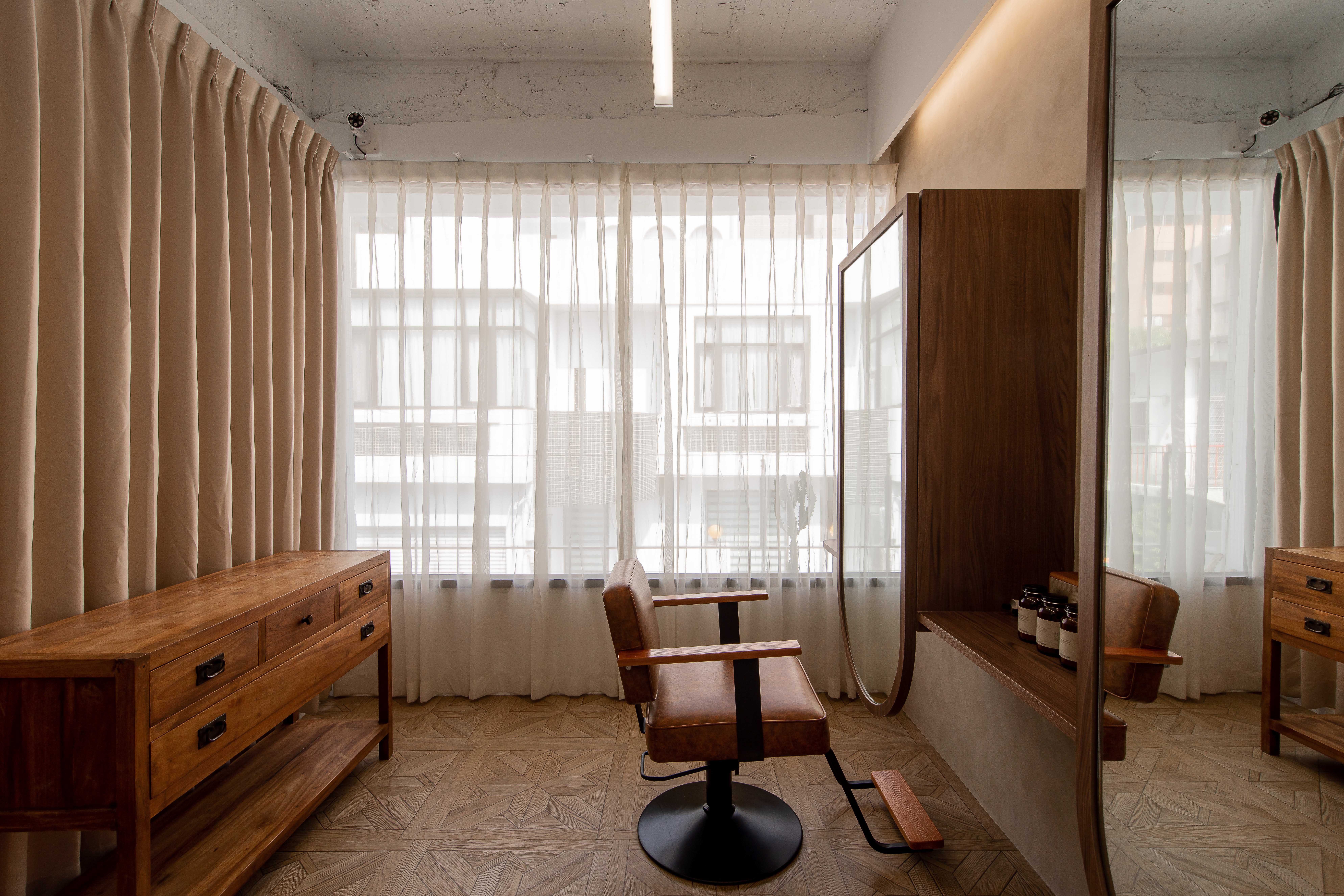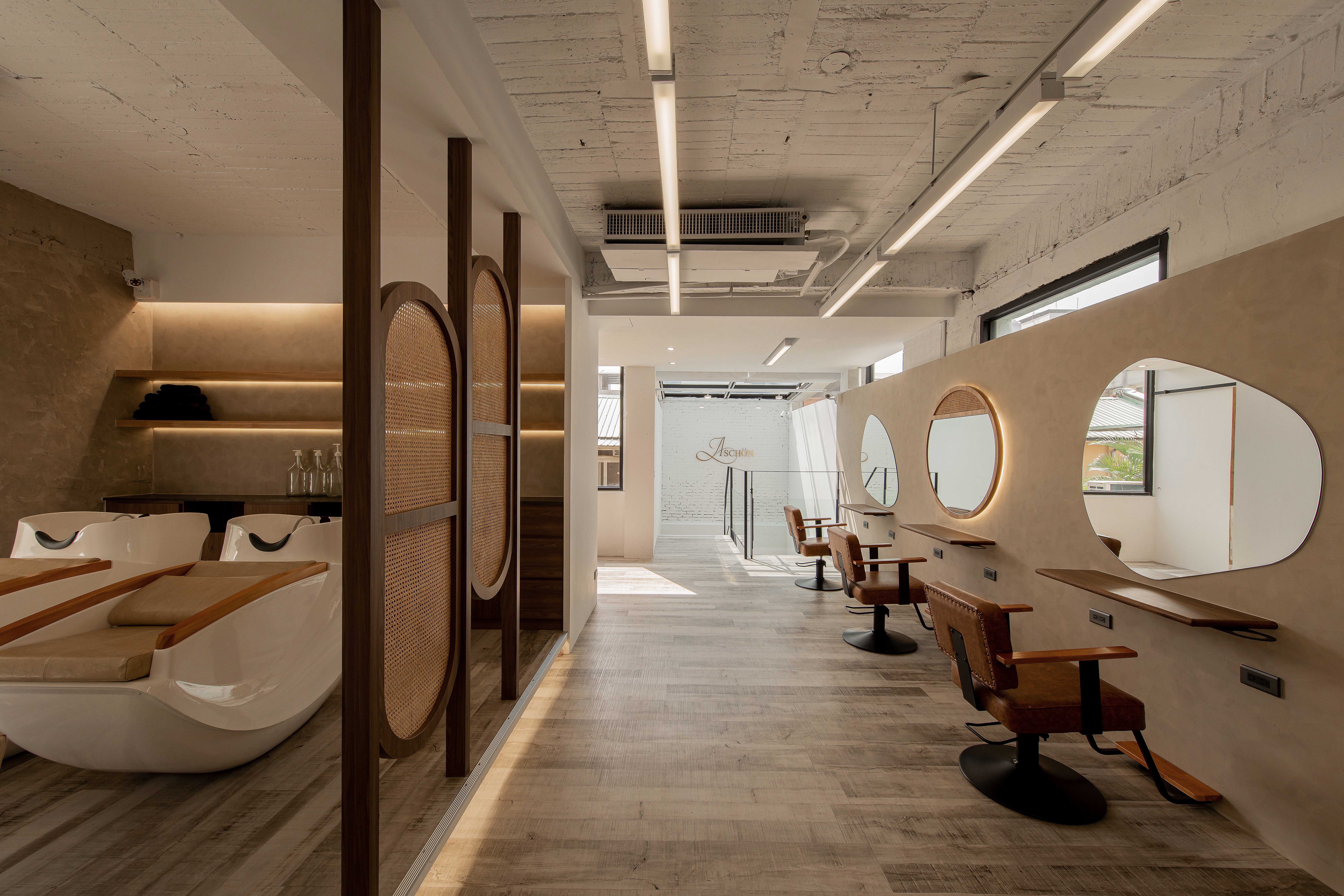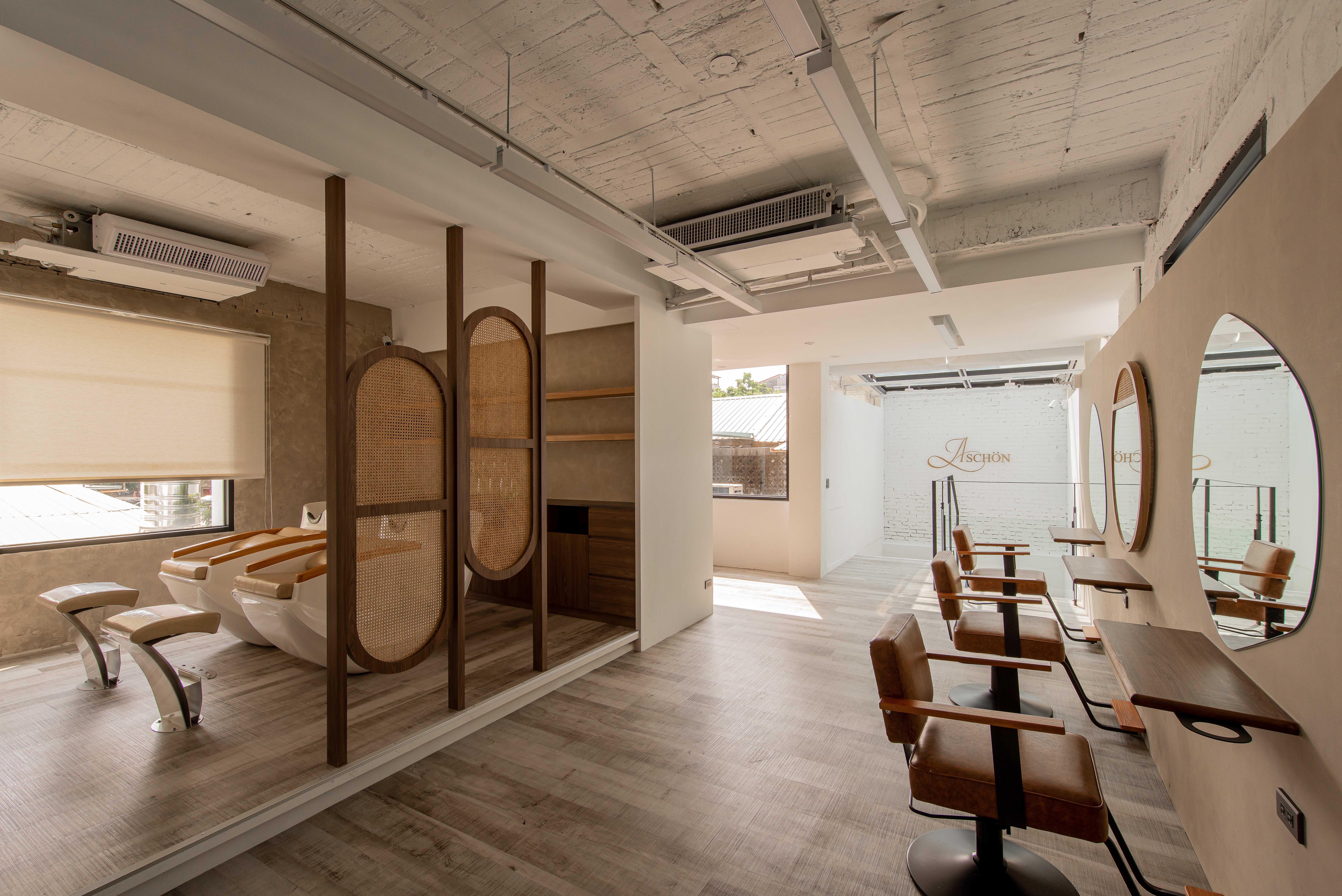 以不修邊幅的隔間及梁柱揉入空間之中,讓美髮區域設計得別具一格,採用了日式風