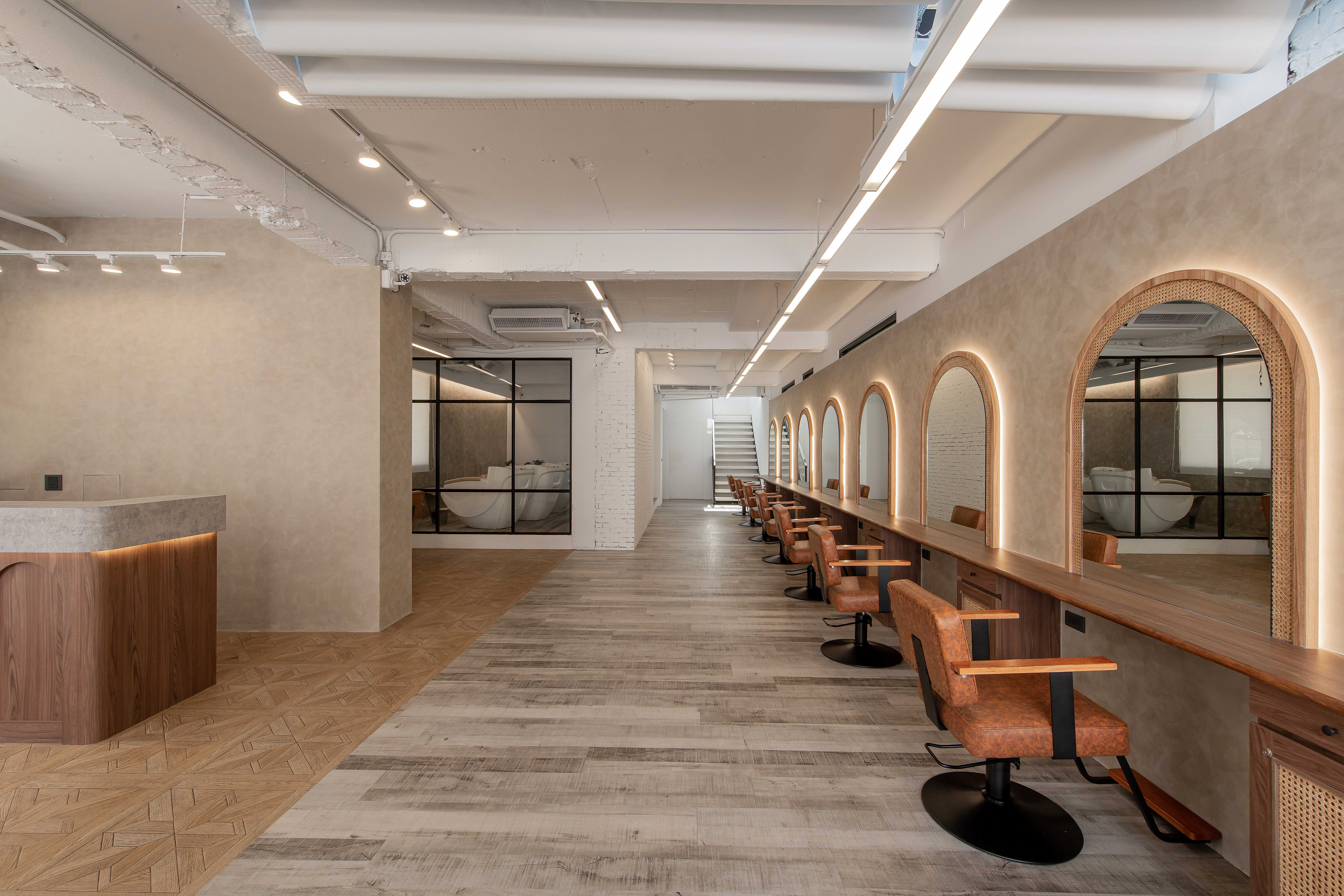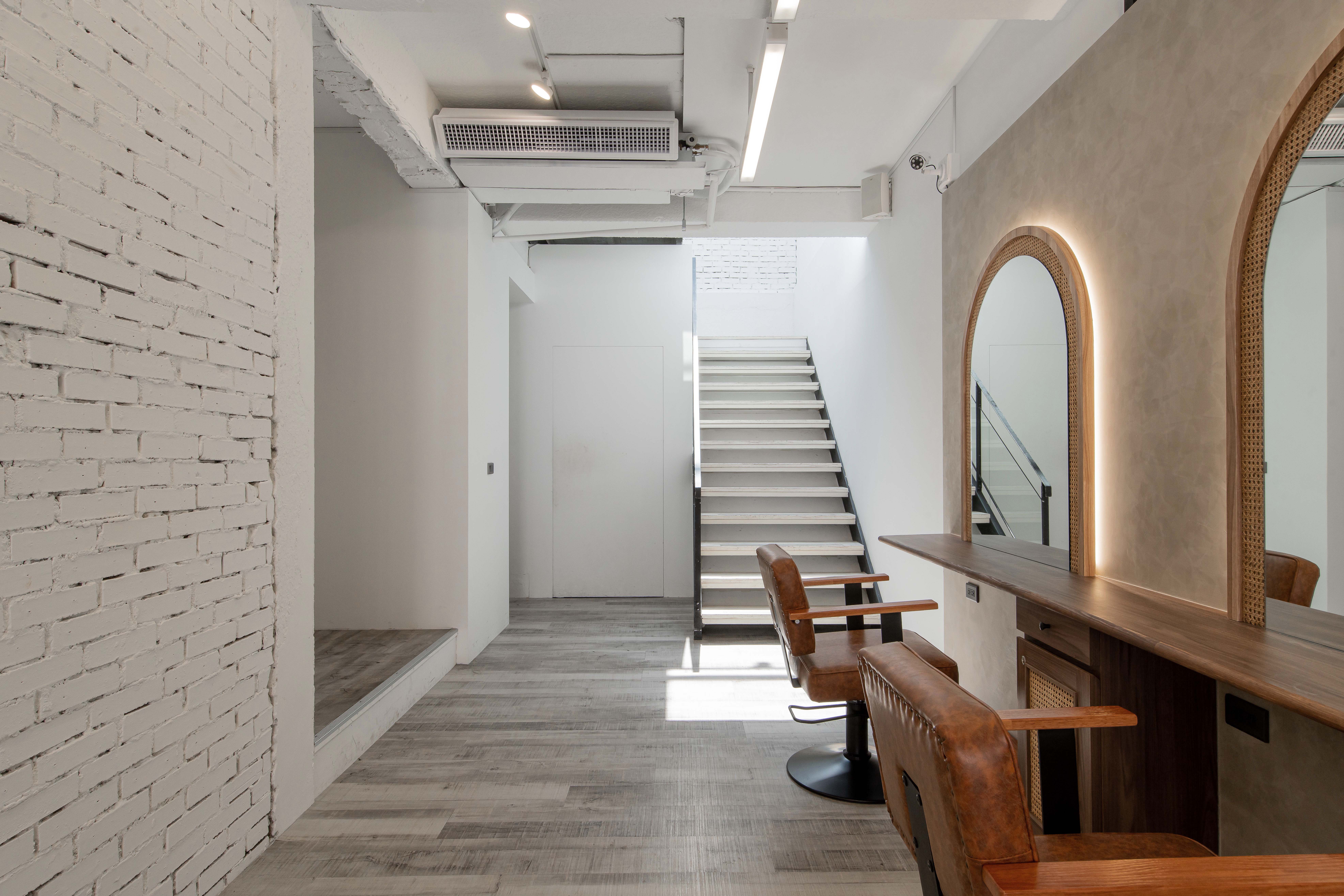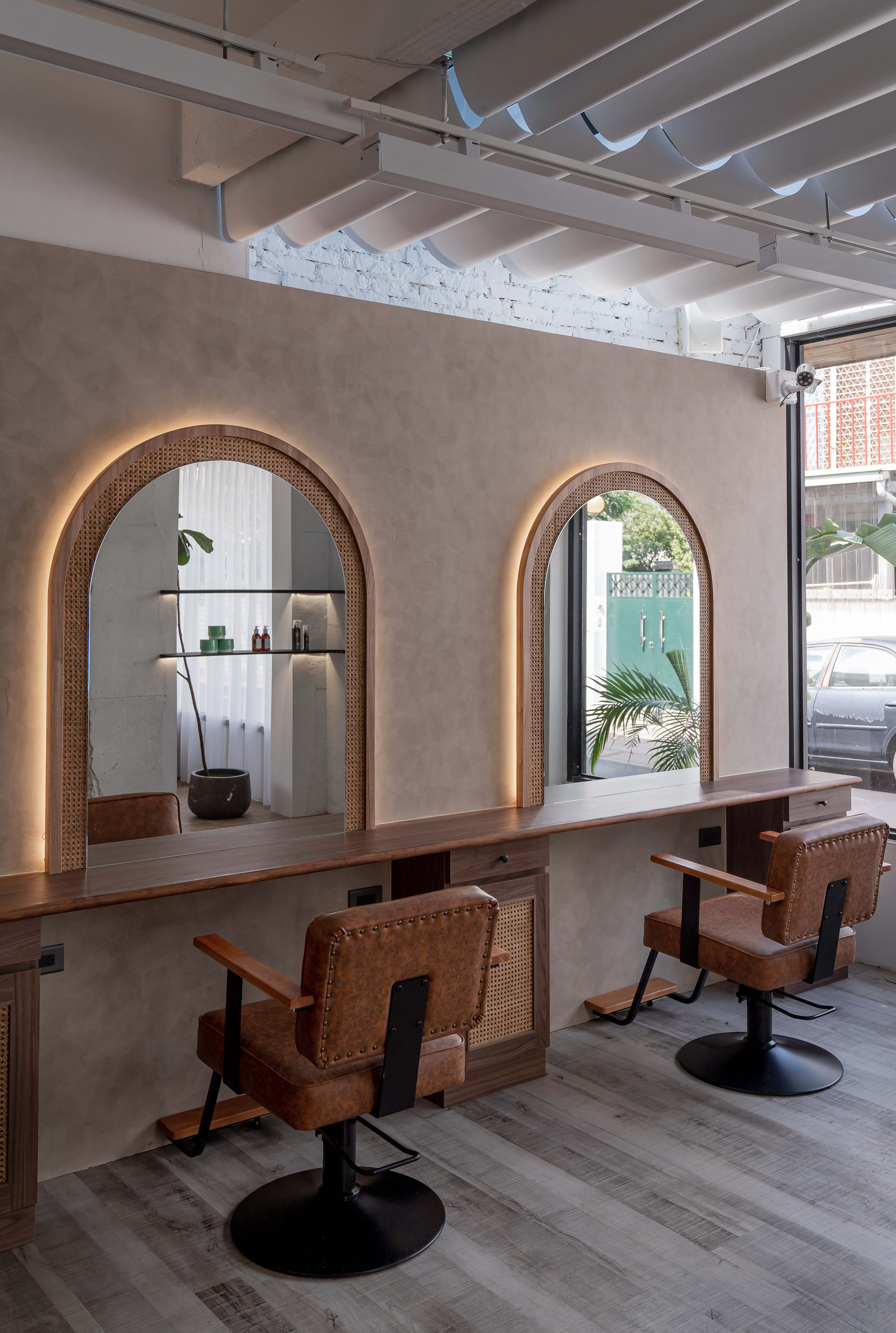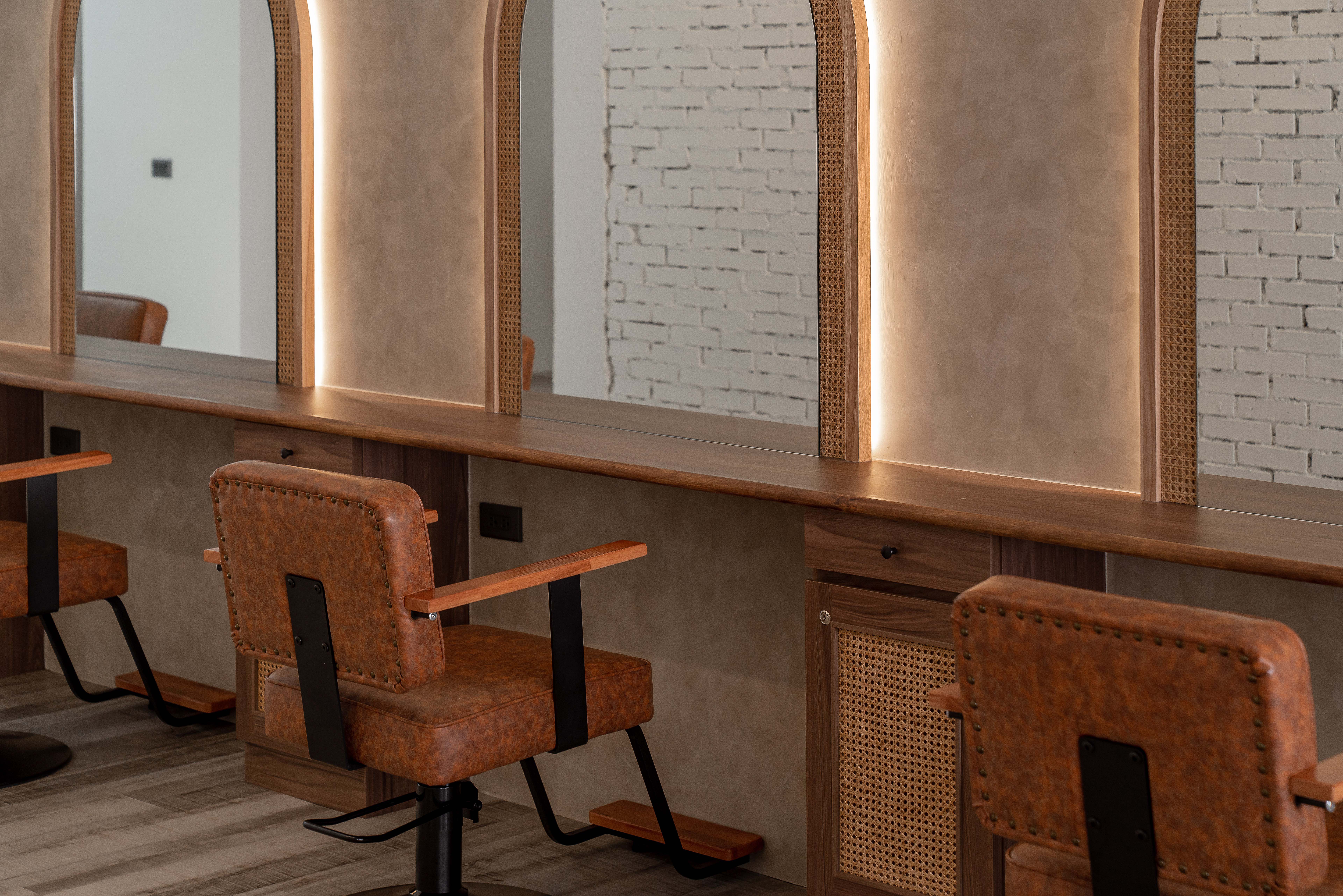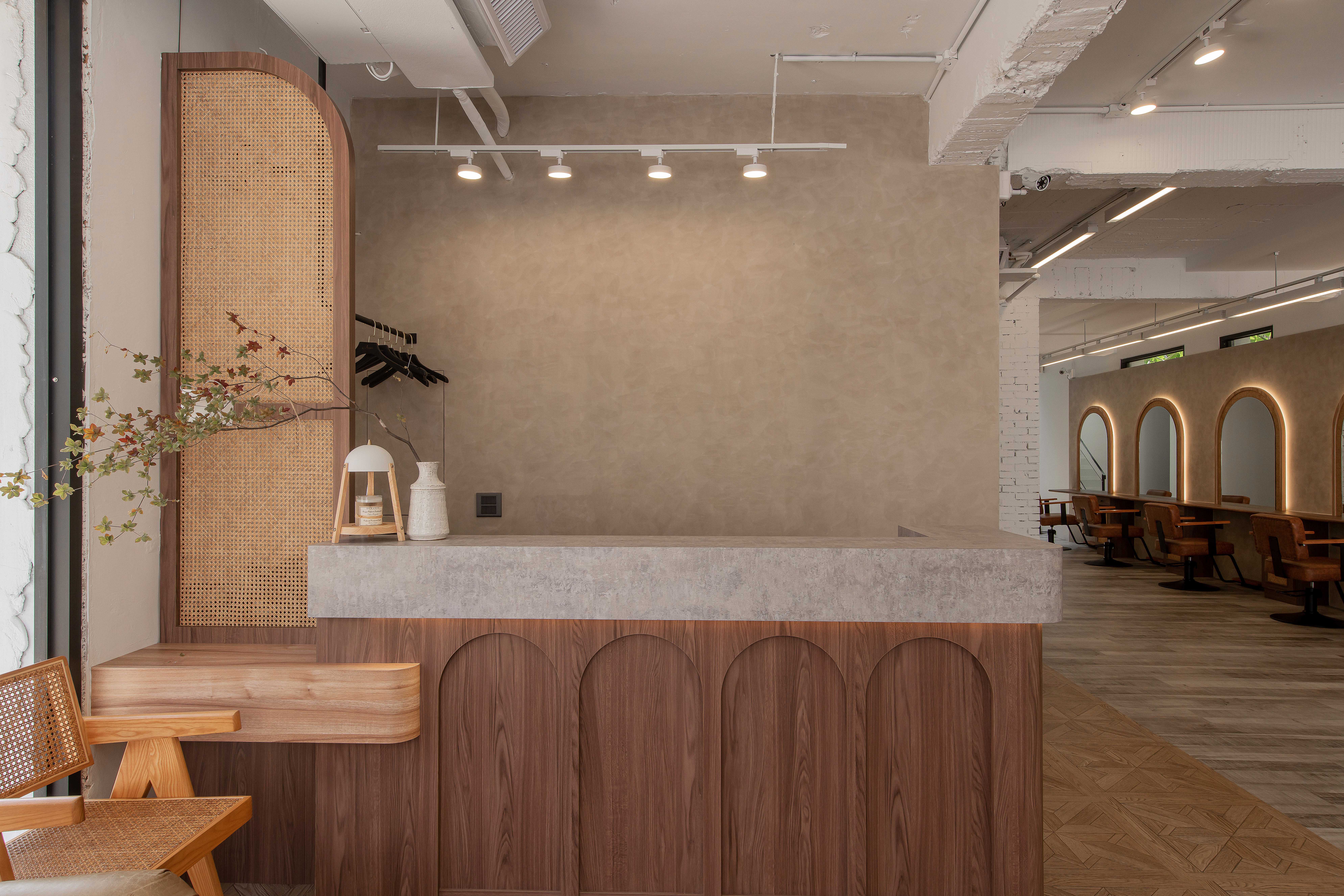 以不修邊幅的隔間及梁柱揉入空間之中,讓美髮區域設計得別具一格,採用了日式風