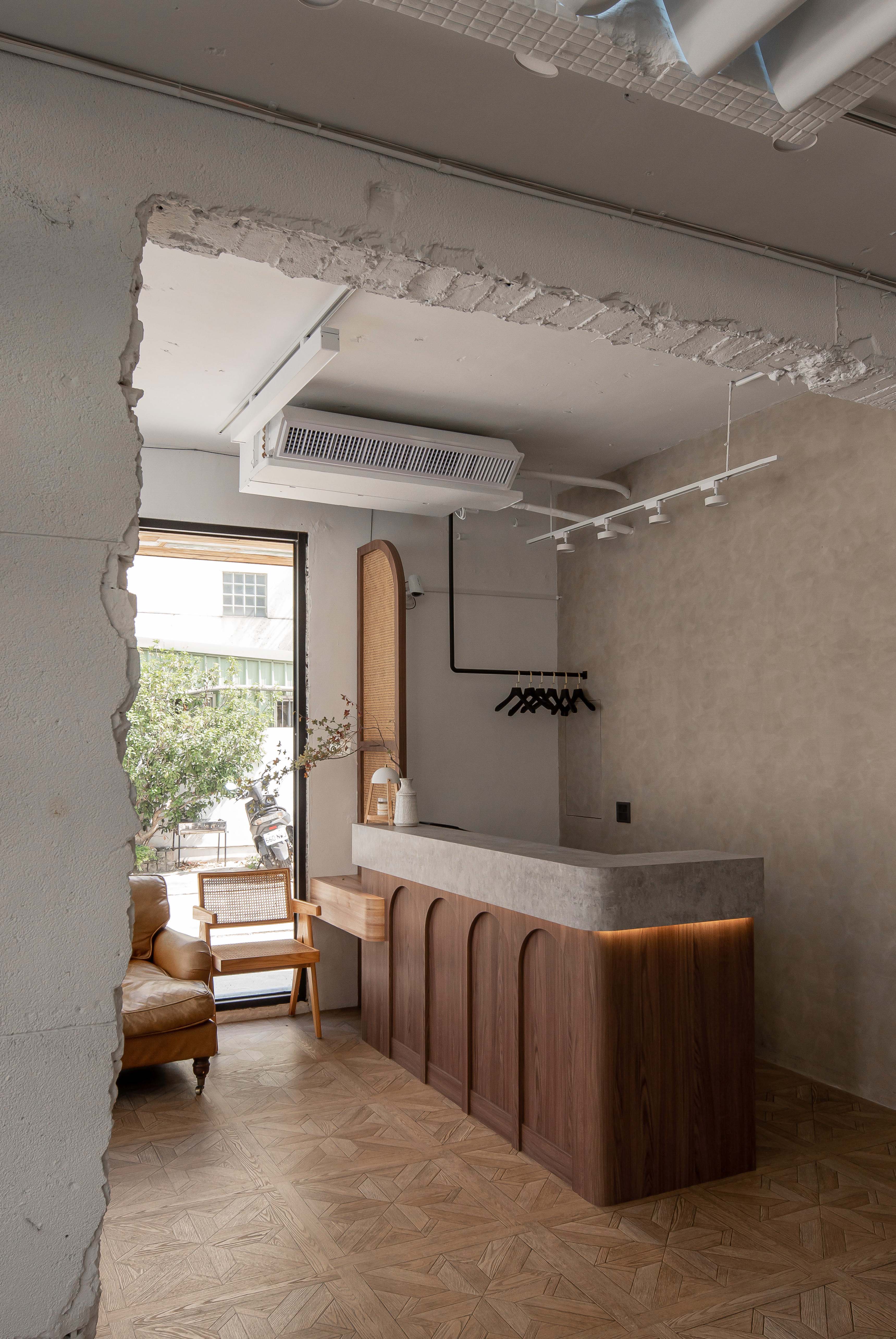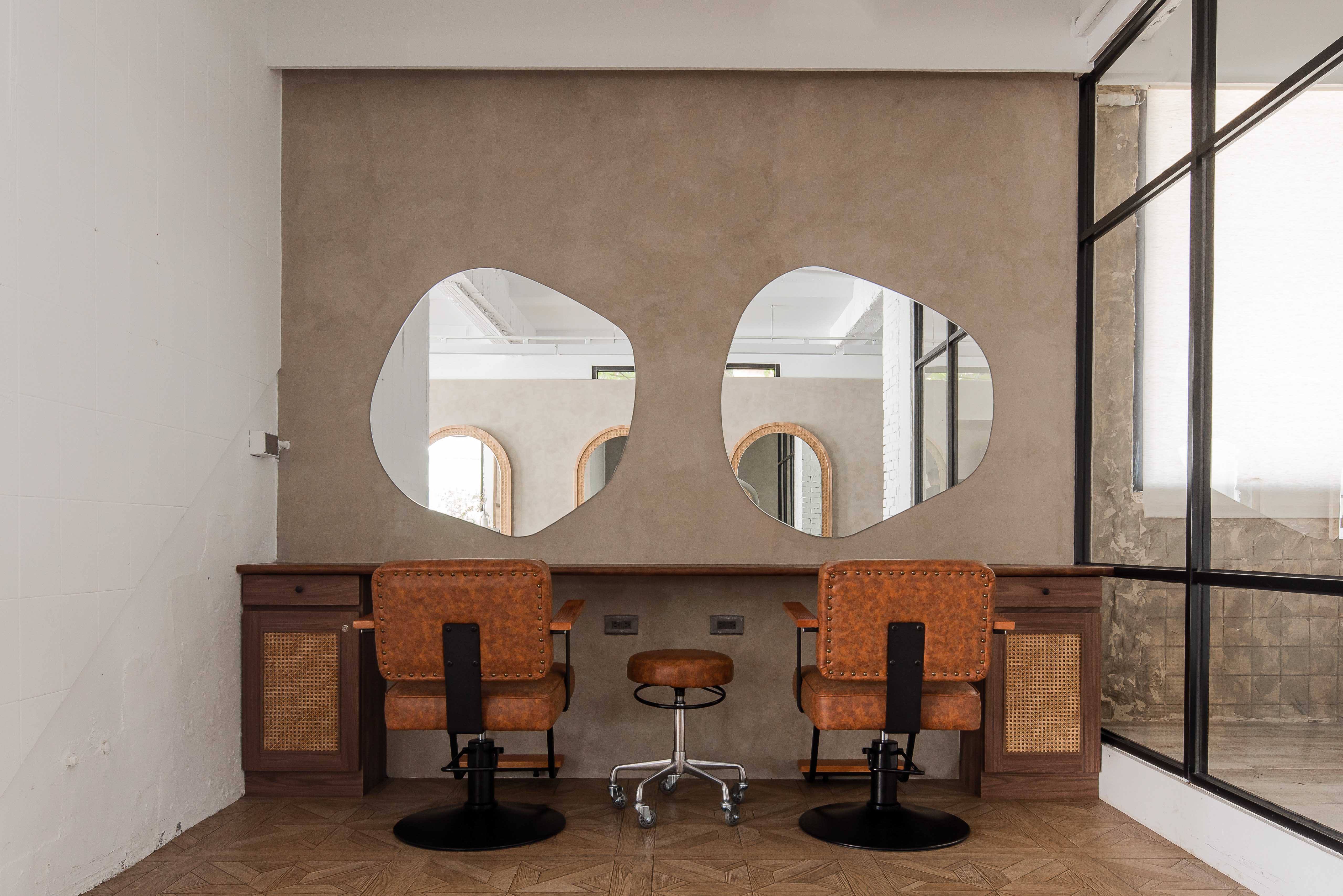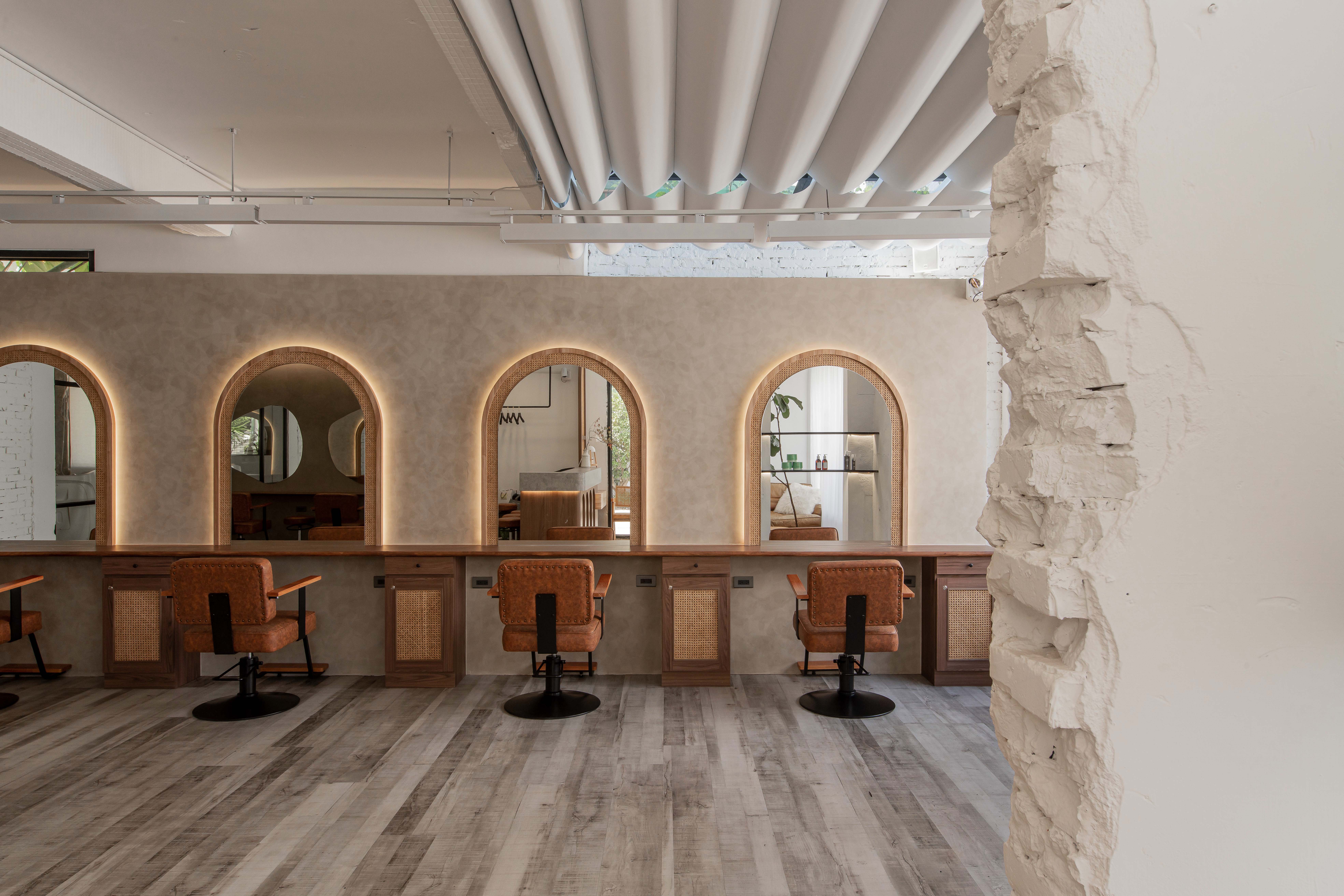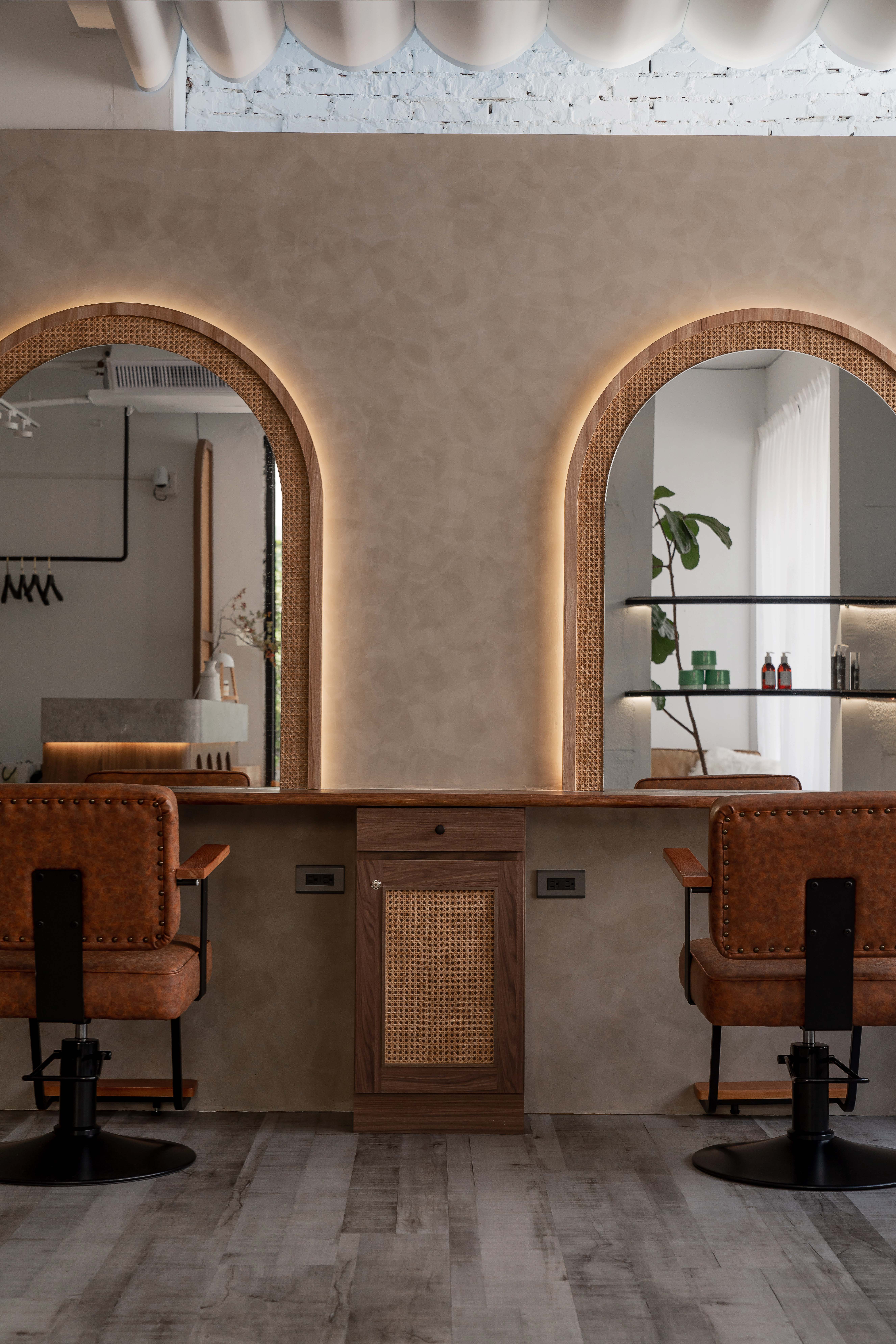 以不修邊幅的隔間及梁柱揉入空間之中,讓美髮區域設計得別具一格,採用了日式風