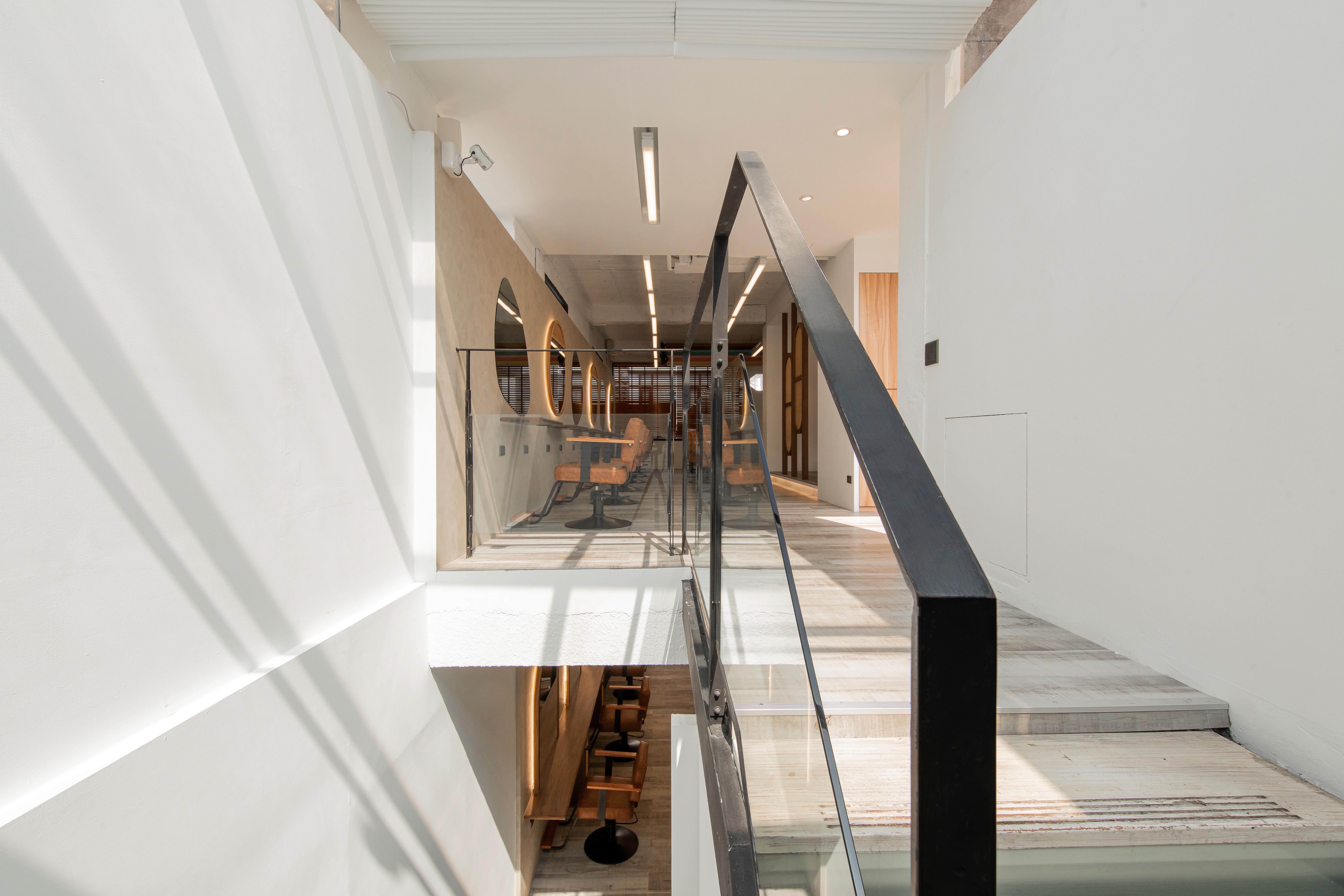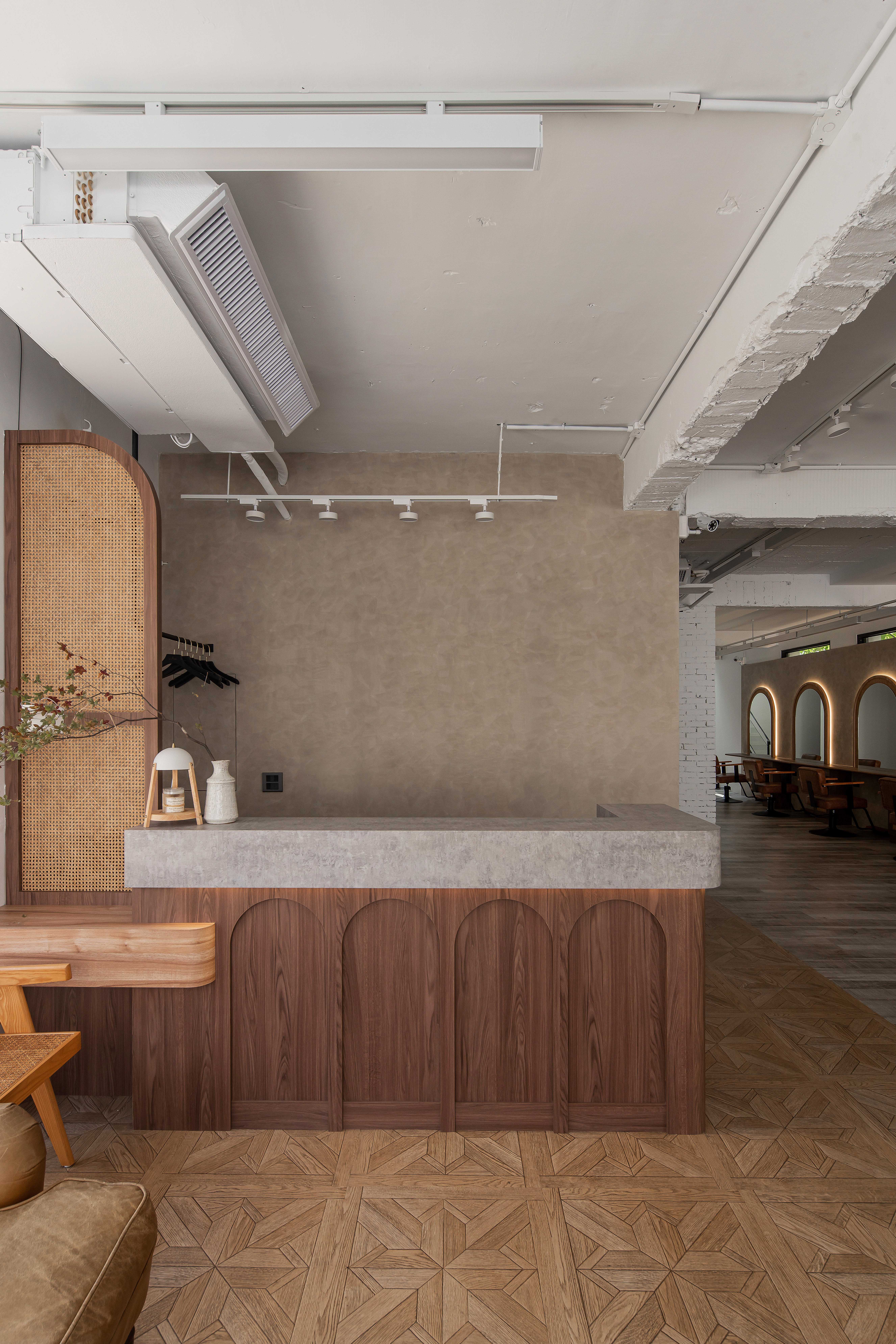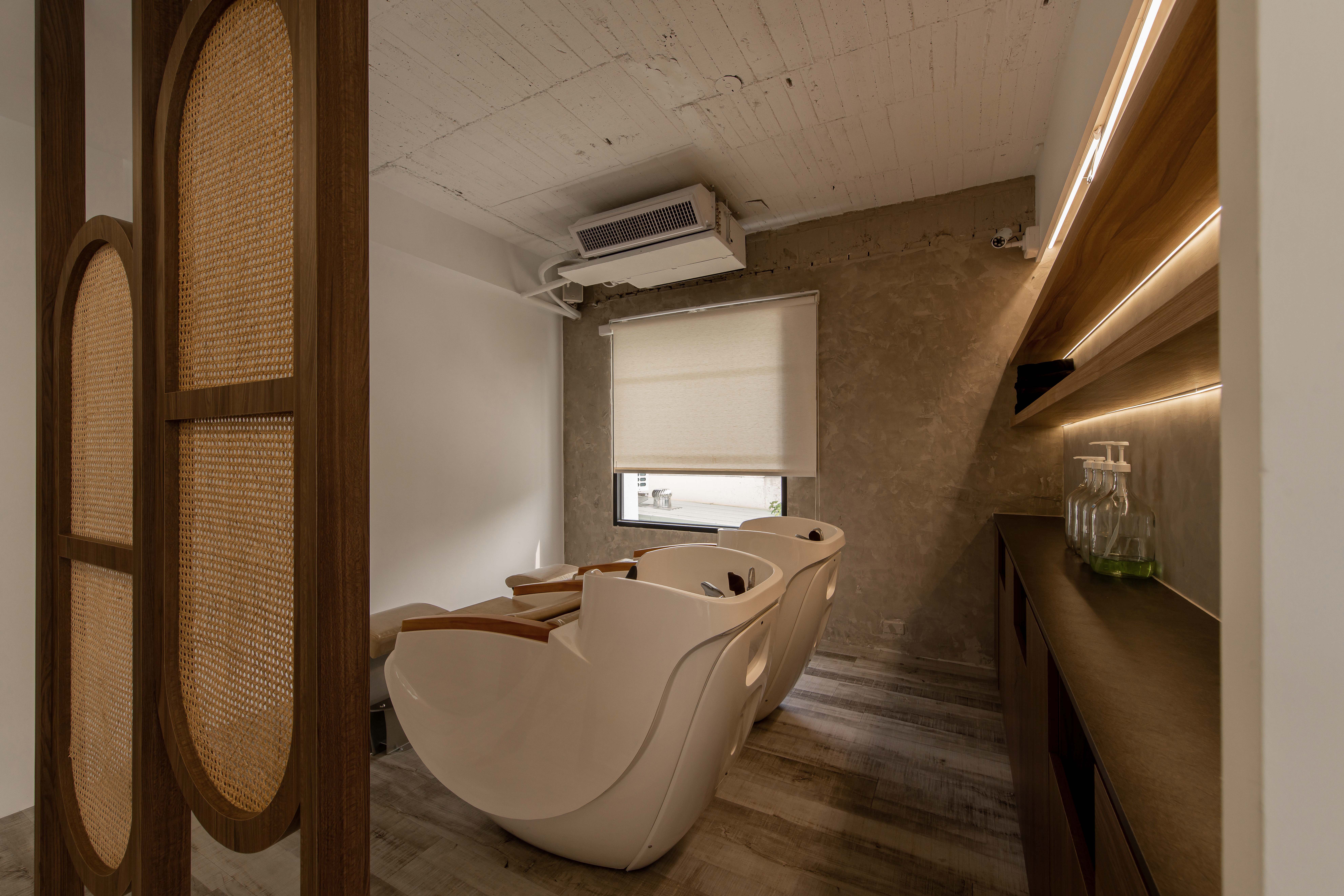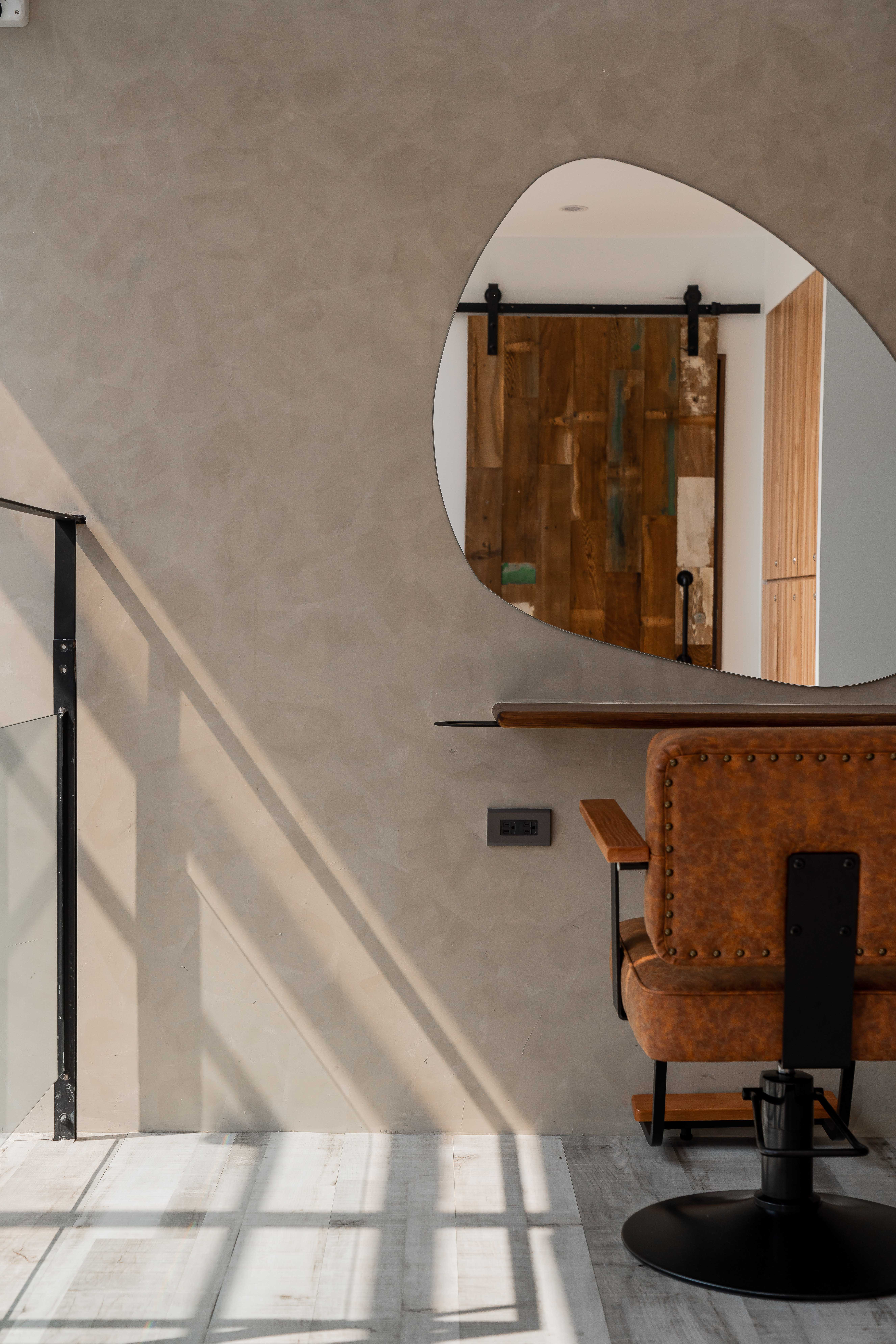 以不修邊幅的隔間及梁柱揉入空間之中,讓美髮區域設計得別具一格,採用了日式風
